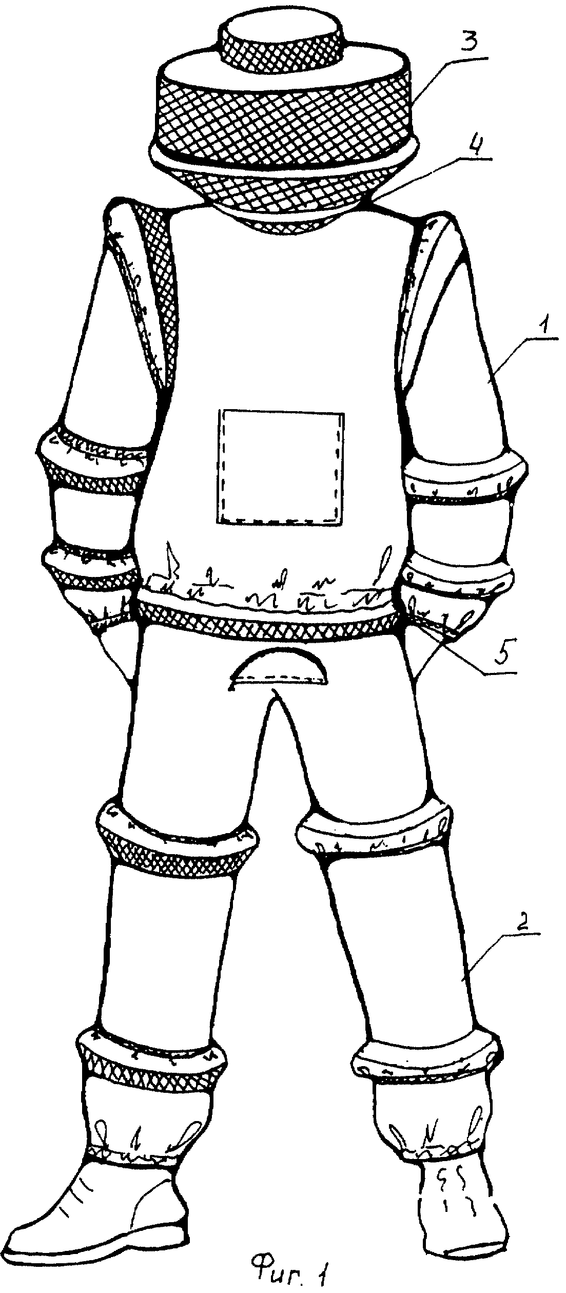 Изобретение относится к средствам индивидуальной защиты головы, туловища, ног (исключая стопы), рук (исключая кисти) пчеловодов. Защитная одежда пчеловодов содержит брюки, куртку с воротником, снабженные вентиляционными вставками, головной убор, состоящий из лицевой сетки с наголовником. Одежда на внутренней поверхности имеет систему упругих ребер, образующих между внутренней поверхностью ткани и кожей человека зазор заданной толщины и устойчивые воздушные каналы. По плечевому шву образован вентиляционный канал для выхода пододежного воздуха в окружающую среду через лицевую сетку и проймы. Одежда имеет клапаны для открывания и закрытия вентиляционных вставок в области проймы, локтевого и лучезапястного сустава, пояса, коленного сустава и нижней части голени. Защитная одежда обеспечивает конструкцию одежды, защищающую от укусов пчел верхнюю и нижнюю части тела, а также вентиляцию пододежного пространства. 1 з.п. ф-лы, 5 ил.