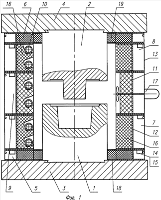 Изобретение относится к оборудованию для обработки металлов давлением. Блок содержит верхний и нижний штамподержатели, модули, образующие рабочую зону нагрева, окно для загрузки заготовок, дверную заслонку с вентилятором и спиральные нагреватели сопротивления. Модули выполнены с двойными металлическими стенками и теплоизоляцией. Два модуля основания установлены на штамподержателях с использованием теплоизоляционных быстросменных вставок. Верхний и нижний модули и модули основания выполнены в виде замкнутых контуров. Остальные модули выполнены с окном для быстросменной дверной заслонки. Спиральные нагреватели расположены в пазах теплоизоляции всех модулей, кроме модулей основания, выполненных с наклоном в сторону ее наружных стенок. В результате обеспечивается сокращение потерь тепла и повышение равномерности прогрева штампов. 2 з.п. ф-лы, 2 ил.