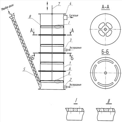 Изобретение относится к области химии. Вибрационный экстрактор непрерывного действия включает вертикальный цилиндрический корпус 1 с устройствами ввода 2, 3, 5 и вывода 4 фаз. В корпусе 1 установлен с возможностью продольного возвратно-поступательного движения шток 7 с закрепленными на нем перфорированными тарелками 8. Тарелки снабжены по периферии бортами, направленными в сторону, противоположную движению фаз. Аппарат разделен на секции по высоте жестко закрепленными перегородками 6 с переточными щелями, расположенными на периферии и по центру перегородок попеременно по высоте аппарата. В каждой секции установлена тарелка, перфорированная отверстиями конической или цилиндрической формы. Размер отверстий перфорации тарелок в нижних секциях аппарата будет больше, чем в последующих. Изобретение позволяет повысить извлечение целевого компонента из сырья и улучшить эксплуатационные характеристики аппарата. 1 ил.