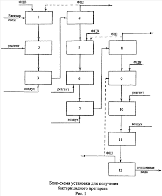 Изобретение относится к технологиям получения композиционных бактерицидных препаратов, обладающих бактерицидной и фунгицидной активностью. Способ включает приготовление дисперсии частиц субстрата, растворов солей бактерицидных металлов из ряда, содержащего серебро и цинк, смешение дисперсии и растворов, обработку смеси реагентом из ряда, содержащего растворимый фосфат, с образованием частиц труднорастворимых соединений металлов и их осаждением на частицах субстрата с образованием композиционного препарата, его выведение, промывку. Ряд металлов дополнительно содержит медь и никель, ряд реагентов дополнительно содержит гидроксид, хлорид и карбонат натрия, в качестве субстрата используют частицы фибриллированных целлюлозных волокон, при этом выведение композиционного препарата проводят напорной флотацией. При этом фибриллированные целлюлозные волокна содержат, в расчете на массу, не менее 94% волокон с длиной не более 1,23 мм и не менее 54% волокон с длиной не более 0,63 мм, при водоудержании не более 4 мл/г волокон. Обработку смеси проводят в две или более стадий. В качестве раствора солей бактерицидных металлов используют промышленные сточные воды, содержащие эти соли. Способ позволяет сократить длительность процесса приготовления суспензии препарата, увеличить концентрацию препарата в суспензии, упростить процесс выведения препарата из суспензии и его переработку и расширить область применения препарата. 3 з.п. ф-лы, 1 ил., 1 табл., 1 пр.