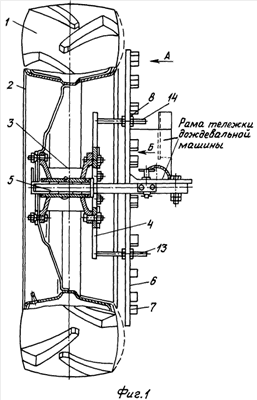 Колесо включает шину с ободом, ступицу с боковыми дисками и осью, приводное кольцо, крепежные элементы для соединения приводного кольца со ступицей, толкатель и противооткатный тормоз. На приводном кольце смонтированы упоры. Тормоз взаимодействует с упорами. Приводное кольцо имеет косынки с отверстиями, установленные в диаметральной плоскости и закрепленные на внутренней поверхности приводного кольца. Приводное кольцо установлено с возможностью изменения осевого положения и фиксации посредством крепежных элементов на штырях с резьбой, расположенных параллельно оси и жестко связанных с боковым диском. Диаметр бокового диска выполнен больше диаметра ступицы. Штыри проходят через отверстия в косынках приводного кольца. Такое конструктивное выполнение позволит повысить надежности работы многоопорных дождевальных машин за счет обеспечения регулирования осевого положения приводного кольца относительно шины с ободом при деформации шины пневматического колеса в процессе работы. 3 ил.