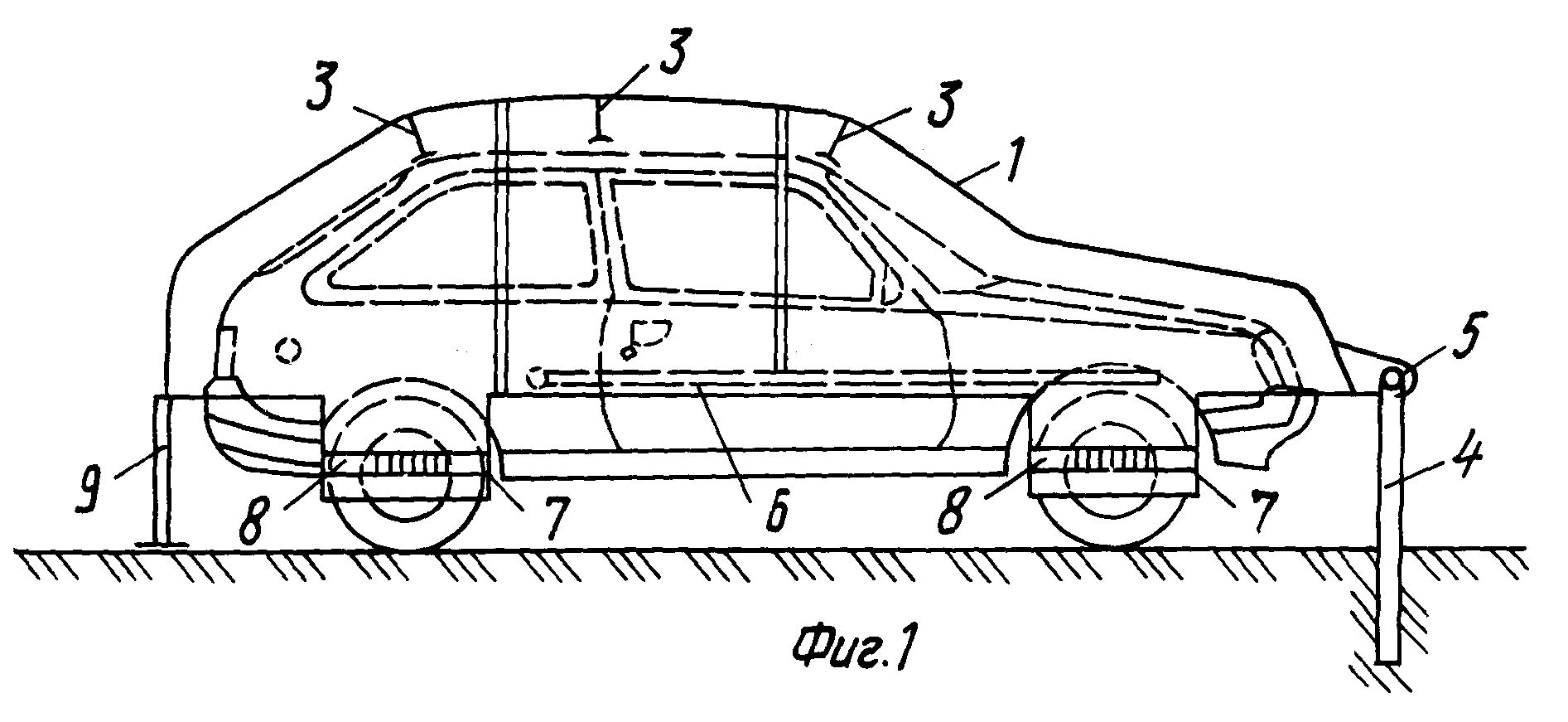 Изобретение относится к укрытиям для легковых автомобилей. Укрытие содержит жесткую оболочку из армированного пластика, обтекающую с установочными зазорами верхнюю часть кузова укрываемого автомобиля. Жесткая оболочка имеет приспособления для ее стационарного закрепления и подъема для въезда или выезда автомобиля и снабжена приспособлением для ее крепления к укрываемому автомобилю. Кроме того, жесткая оболочка дополнительно армирована несущими дугами из легкого антикоррозийного материала, импрегнированными в пластик, а внутренняя ее поверхность имеет приливы для фиксации установочных зазоров и выполнена с возможностью стока по ней конденсата, образующегося при перепадах температур и влажности окружающего воздуха. Приливы выполнены с возможностью их упора на поверхность кузова укрываемого автомобиля при вертикальных нагрузках, в 1,5-2,0 раза превышающих собственный вес жесткой оболочки. При въезде и выезде укрываемого автомобиля задняя или передняя часть жесткой оболочки поднимается вокруг шарнира, размещенного на стационарной опоре, освобождая проезд. На время выезда или заезда жесткая оболочка в поднятом положении поддерживается за счет убирающихся опор или за счет остановки привода подъема и опускания. Достигаемый при этом технический результат состоит в сохранении естественного воздухообмена в укрываемом объеме при внешнем нагружении жесткой оболочки, например при снеговых нагрузках. 9 з.п. ф-лы, 2 ил.