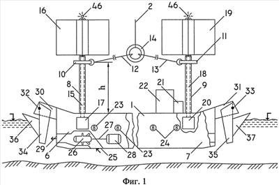 Изобретение относится к речному транспорту и может быть круглогодично использовано для перемещения людей и транспортных средств с одного берега реки на другой. Речной паром содержит плавсредство с симметричными носовыми частями, на которых вертикально установлены стволы, имеющие в верхней части кольца, канаты, два карусельных ветродвигателя, гидротурбины, установленные в цилиндрических проточных каналах, электрогенераторы, которые соединены с аккумуляторными батареями, размещенными на палубе плавсредства у пульта управления. При этом один конец каната закреплен на кольце опоры, установленной на дне середины реки в верхнем ее течении, а другой, разветвленный, на кольцах стволов - плавсредства. Внутри каждой носовой части плавсредства, в днище которого выполнены всасывающие отверстия, установлен водометный движитель в виде многолопастной крыльчатки, соединенной при помощи вала с элкетродвигателем. Достигается улучшение условий эксплуатации паромов больших размеров, обеспечиваются электрификация и механизация процессов круглогодичного перемещения парома с одного берега на другой, даже при наличии ледовой обстановки. 4 ил.