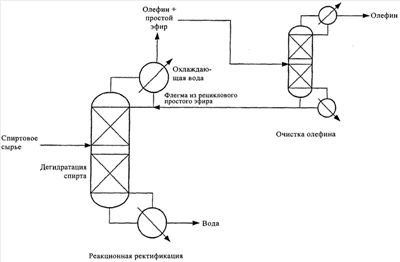 Изобретение относится к способу получения алкена (алкенов) из исходного материала, включающего по меньшей мере один одноатомный алифатический парафиновый спирт, содержащий от 2 до 5 углеродных атомов, характеризующемуся следующими стадиями; 1) одноатомный алифатический парафиновый спирт (спирты), содержащий от 2 до 5 углеродных атомов, в реакционно-ректификационной колонне под повышенным давлением и при повышенной температуре превращают в поток головных погонов, включающий алкен (алкены) и простой эфир (эфиры) с соответствующими аналогичными числами углеродных атомов, 2) затем поток головных погонов со стадии 1 разделяют на обогащенный простым эфиром (эфирами) поток и обогащенный алкеном (алкенами) поток, 3) далее по меньшей мере часть, предпочтительно целиком, обогащенного простым эфиром (эфирами) потока со стадии 2 возвращают в виде флегмы в реакционно-ректификационную колонну, 4) одновременно обогащенный алкеном (алкенами) поток со стадии 2 разделяют на алкен (алкены) и простой эфир (эфиры), 5) затем по меньшей мере часть, предпочтительно все количество, выделенного простого эфира (эфиров) со стадии 4 возвращают в упомянутую реакционно-ректификационную колонну, после чего 6) со стадии 4 выделяют поток алкена (алкенов). Также изобретение относится к способу превращения углеводородов в алкен, включающему описанный выше способ. Использование настоящего изобретения позволяет снизить затраты на отделение целевых продуктов от побочных. 2 н. и 9 з.п. ф-лы, 1 ил., 1 табл.