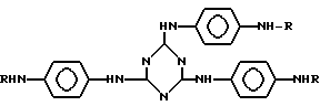 Использование: создание озоностойких резиновых изделий. Сущность изобретения: продукт ф - лы (I), где R-С3 - C6-циклоалкил, незамещенный или замещенный 1 - 2 С1 - С4-алкилом, или С3 - С7-алкил с разветвленной цепью, который может быть использован как антиозонат для термореактивных каучуковых композиций. Реагент 1: цианурхлорид. Реагент 2: соответствующий N-алкил-n-фенилендиамин. 2 с. и 3 з. п. ф - лы, 7 табл.