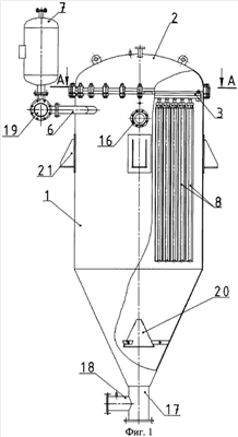 Изобретение относится к технике фильтрования в сахарной промышленности соков I и II сатурации, фильтрования сиропа, а именно к патронным фильтрам, предназначенным для очистки жидкости от механических примесей. Патронный фильтр включает вертикальный цилиндрический корпус с конической нижней частью и крышкой, установленные внутри корпуса вертикально параллельными рядами фильтровальные патроны, консольно прикрепленные верхней частью к размещенным под крышкой коллекторным трубкам, и имеющие в поперечном сечении центральные участки в форме эллипса и радиально расположенные относительно вертикальной оси патрона периферийные участки и закрепленную снаружи на патронах фильтровальную ткань. Коллекторные трубки присоединены к патрубкам отвода фильтрата, которые подключены к закрепленному на корпусе ресиверу для сжатого воздуха. Корпус снабжен руками для подвода жидкости, декомпрессии и выгрузки осадка, расположенным в его верхней части прижимным устройством для вертикальной фиксации патронов, содержащим горизонтально и поперечно расположенные относительно рядов фильтровальных патронов траверсы. Радиально расположенные периферийные участки каждого фильтровального патрона образуют сужающиеся каналы. В зоне между центральным и периферийными участками поверхность патрона изогнута внутрь патрона, а фильтровальная ткань закреплена на поверхности патронов с возможностью ее перемещения относительно наружной поверхности указанных участков для ее очистки от осадка. Поверхность радиально расположенных периферийных участков фильтровальных патронов следует выполнять волнообразной. Изобретение обеспечивает повышение производительности фильтра, повышение эффективности очистки фильтровальной ткани, уменьшение вибрации фильтровальных патронов при импульсном подводе в них сжатого воздуха и увеличение удельной площади фильтрации аппарата. 1 з.п. ф-лы, 8 ил.