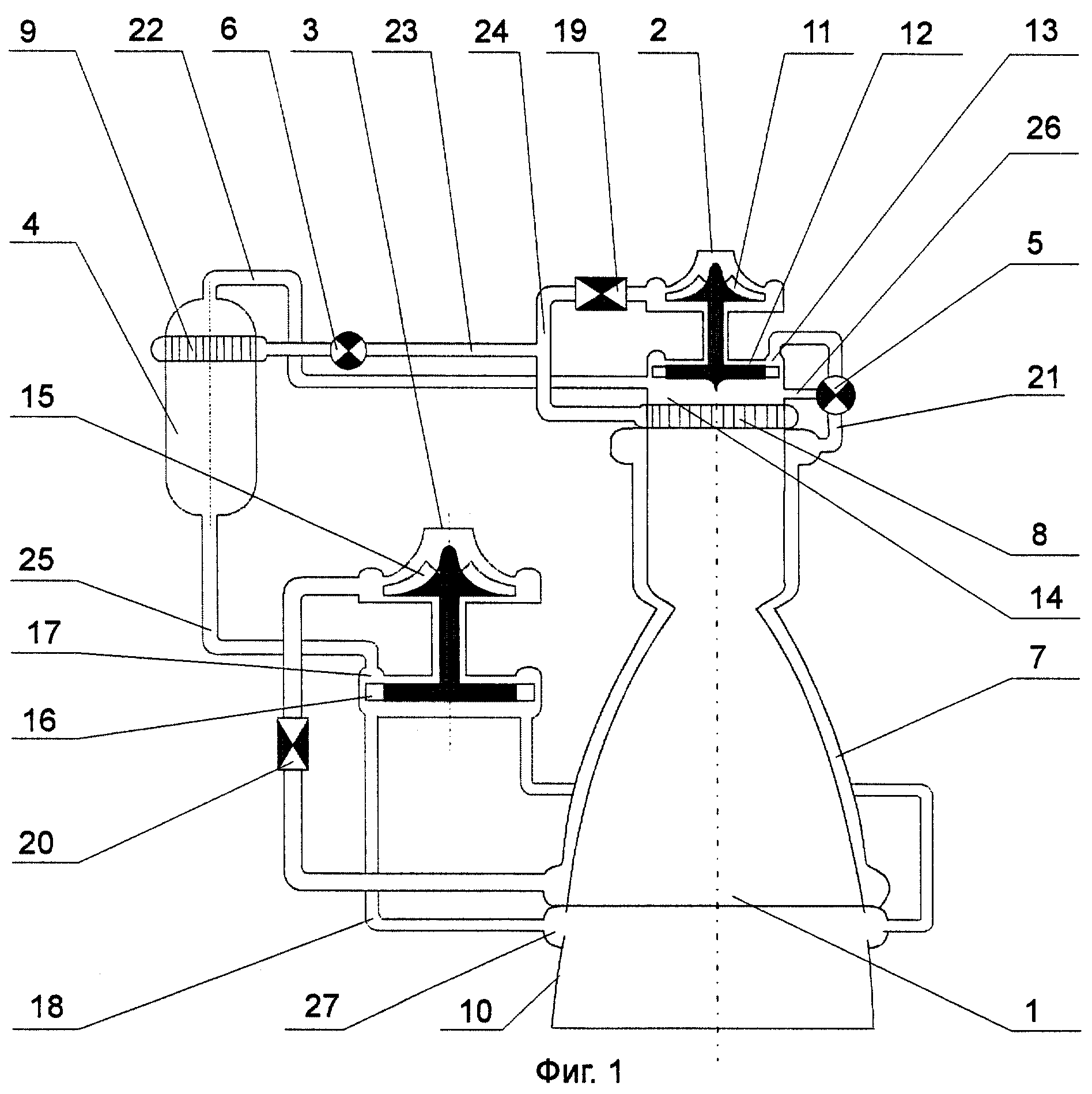 Кислородо-водородный жидкостный ракетный двигатель предназначен для использования в транспортных космических системах. Двигатель включает камеру с трактом регенеративного охлаждения водородом и автономные турбонасосные агрегаты. Кислородный насос одного турбонасосного агрегата снабжен приводом по замкнутой безгазогенераторной схеме с дожиганием. Водородный насос другого турбонасосного агрегата снабжен приводом по открытой газогенераторной схеме на основных компонентах топлива. Выходная полость турбины турбонасосного агрегата кислорода сообщена газоводом со смесительной головкой газогенератора привода турбонасосного агрегата водорода. Изобретение позволяет увеличить удельный импульс тяги двигателя и уменьшить его габариты при неизменной степени расширения сопла за счет повышения давления в камере, достигаемого повышением давления за насосом первого турбонасосного агрегата. 2 ил.