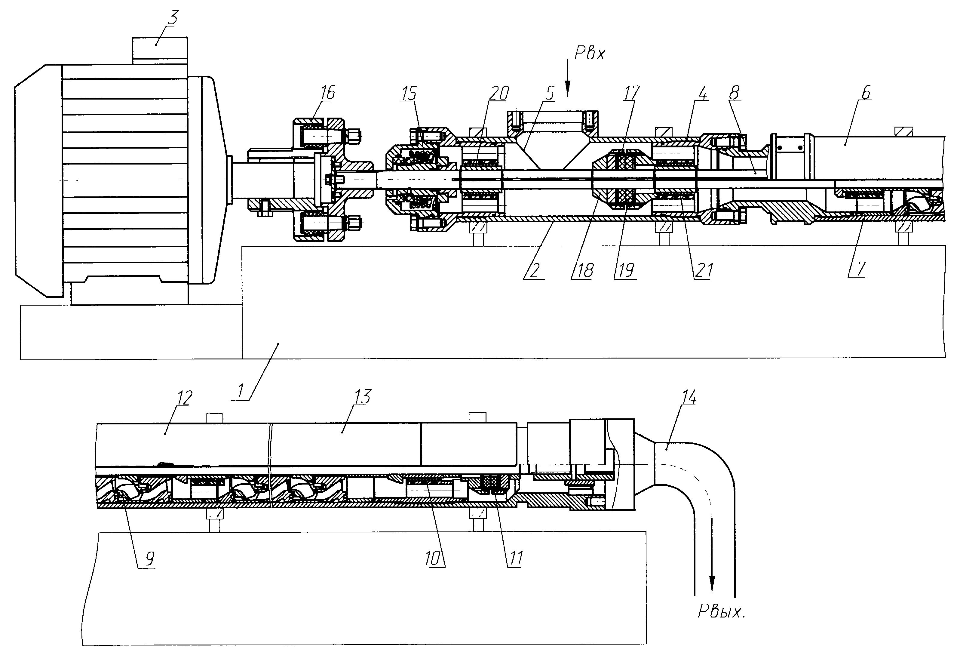 Горизонтальная насосная установка предназначена для закачки в пласт технологической жидкости, используемой в системе поддержания пластового давления. Установка содержит размещенные на опорной раме электродвигатель, входной модуль и горизонтальный центробежный насос, сочлененный с узлами всасывания и нагнетания. Горизонтальный центробежный насос выполнен секционным с возможностью подбора ступеней на требуемый напор. Первая секция насоса выполнена совмещенной с узлом входного модуля и расположена с ним на общем валу, уплотненном со стороны электродвигателя торцевым уплотнением. В узле входного модуля размещен упорный узел. Входной модуль содержит два дополнительных радиальных подшипника. Подшипники жестко фиксируют вал в радиальном направлении и предотвращают его биение, а устранение лишних соединительных элементов повышает эксплуатационную надежность и долговечность установки. 1 ил.