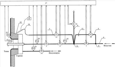 Изобретение относится к области теплоэнергетики и может быть использовано для контроля и регулирования режима горения теплогенерирующих установок. Устройство автоматического контроля и управления газовой горелкой содержит газопровод с последовательно установленными на нем двумя предохранительно-запорными клапанами, обводной трубопровод с установленными на нем клапанами опрессовки и дросселя, которые установлены параллельно первому предохранительно-запорному клапану, при этом трубопровод запальника с запальным клапаном и отводной трубопровод с клапаном безопасности имеют общую точку соединения с газопроводом и обводным трубопроводом, на газопроводе после второго предохранительно-запорного клапана установлена дроссельная заслонка, на выходе запального трубопровода через гибкий шланг подключен запальник с искроразрядником, а также введены воздушный шибер и узел управления, выводы которого соединены с управляющими входами и информационными выходами всех клапанов, дроссельной заслонки и шибера, с входом искроразрядника запальника, датчики давления газа в газопроводе и на входе сопла горелки, давления воздуха, наличия факела запальника и факела горелки. Техническим результатом является исключение возможности образования «микровзрыва» при автоматическом розжиге горелки и обеспечение автоматического регулирования ее тепловой мощности в рабочем диапазоне при постоянном поддержании минимального содержания вредных веществ в дымовых газах. 1 ил.