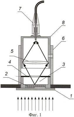 Изобретение относится к детектированию температуры теплового излучения фронта ударной волны и может быть использовано для изучения быстропротекающих процессов при изучении конденсированных материалов и свойств взрывчатых веществ. В цилиндрическом корпусе устройства содержится индикаторная жидкость или индикаторные стекла. Цилиндрический корпус состоит из верхней и нижней частей, установленных с возможностью взаимного вертикального перемещения или выполненных в виде единой конструкции. На верхнем торце корпуса в фокусе линзы содержится оптический разъем световода. С другой стороны линзы на расстоянии одного фокуса закреплен стакан для образца и индикаторная жидкость или индикаторное стекло. Технический результат - возможность регистрации температуры по энергетической яркости свечения индикатора. 1 з.п. ф-лы, 2 ил.