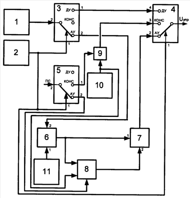 Устройство безударного перехода с одного параметра управления на другой относится к автоматике и предназначено для использования в системах управления энергоустановками со следящим приводом регулирующего органа. Технический результат заключается в обеспечении возможности безударного перехода с одного параметра управления на другой на режимах дистанционного, автоматического управления и в режиме консервации процесса регулирования при повышении точности управления и надежности устройства. Устройство содержит задатчик управляющего сигнала, коммутаторы и задатчик режима работы, выход которого связан с первыми входами коммутаторов, суммирующий усилитель, предназначенный для формирования разностного сигнала, первый вход которого связан с выходом датчика регулируемого параметра, интегрирующий усилитель, блок памяти и суммирующий усилитель, предназначенный для формирования суммирующего сигнала. 1 ил.