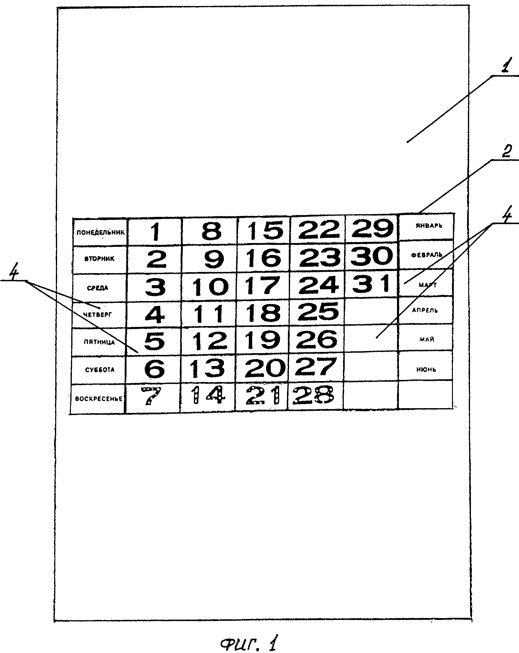 Изобретение относится к вечным месячным календарям, которые используются для наглядного отсчитывания проходящих дней и текущих дней месяца, причем календарь может быть использован для любого месяца любого года. Изобретение обеспечивает простоту конструкции, простоту и удобство в его использовании. Календарь содержит корпус, состоящий из лицевой панели с окном позиционирования выбранного месяца и рамы, и календарное поле, состоящее из элементов, сгруппированных в блоки и несущих обозначения чисел месяца с различным внешним оформлением, дней недели и месяцев года. Календарное поле состоит из 79 трехгранных элементов, из которых 57 - с обозначениями чисел месяца, 7 - с обозначениями дней недели, 6 с обозначениями месяцев года, остальные не имеют обозначений. Элементы календарного поля сгруппированы в блоки с помощью стержней, два из которых зафиксированы в лицевой панели, а пять с числами месяца зафиксированы в раме и вместе с ней установлены подвижно относительно лицевой панели. Имеются средства фиксации стержней в раме и лицевой панели. Элементы календарного поля установлены на стержнях с возможностью поворота вокруг оси стержня и фиксации в трех положениях. Блоки с элементами календарного поля могут быть расположены как в горизонтальном, так и в вертикальном направлениях. 3 з.п. ф-лы, 7 ил.