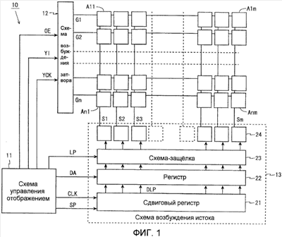 Изобретение относится к устройству отображения, а конкретнее к управляемому током устройству отображения. Техническим результатом является увеличение продолжительности включения свечения и повышение качества изображения. Устройство отображения содержит схему пикселя, включающую: приводной элемент, предусмотренный на дорожке, соединяющей первое соединение со вторым соединением, имеющий управляющий вывод, первый вывод и второй вывод и управляющий током, текущим по дорожке; электрооптический элемент, предусмотренный последовательно с приводным элементом на дорожке, подключаемый к первому выводу приводного элемента и излучающий свет с яркостью в соответствии с током, текущим по дорожке; первый переключающий элемент, предусмотренный между первым выводом приводного элемента и строкой данных; второй переключающий элемент, предусмотренный между управляющим выводом и вторым выводом приводного элемента; третий переключающий элемент, предусмотренный между вторым выводом приводного элемента и первым соединением; и конденсатор, предусмотренный между управляющим выводом приводного элемента и третьим соединением. 3 н. и 9 з.п. ф-лы, 9 ил.
