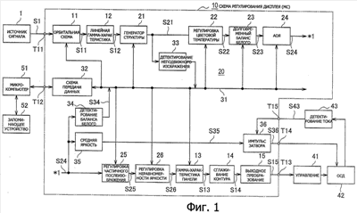 Изобретение относится к схеме регулирования дисплея по видеосигналу, подаваемому в панель органической электролюминесценции. Технический результат заключается в возможности более простого и точного детектирования состояния управления панелью органической электролюминесценции и выполнения различных регулировок и управления. Схема регулирования дисплея панели органической электролюминесценции содержит схему линейной гамма-характеристики для подачи видеосигнала, регулируемого с заданной гамма-характеристикой, для преобразования в видеосигнал с линейной гамма-характеристикой путем компенсации регулирования гамма-характеристики передаваемого видеосигнала и для вывода, схему регулирования для подачи видеосигнала, выводимого из схемы линейной гамма-характеристики, и схему гамма-характеристики панели, куда подают видеосигнал, из схемы регулирования для преобразования в видеосигнал с гамма-характеристикой, соответствующей гамма-характеристике панели органической электролюминесценции, и для вывода. При этом схема регулирования включает в себя модуль детектирования, предназначенный для детектирования состояния управления или предыстории управления панели органической электролюминесценции из подаваемого видеосигнала, модуль регулирования, предназначенный для выполнения регулирования видеосигнала, передаваемого в панель органической электролюминесценции, по выходу детектирования модуля детектирования. 3 н. и 16 з.п. ф-лы, 9 ил.