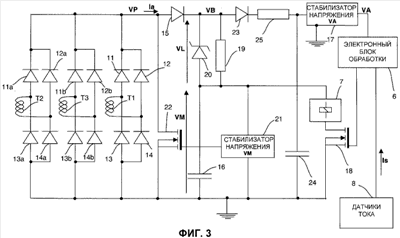 Использование: в области электротехники. Технический результат заключается в увеличении быстродействия. Электронное отключающее устройство содержит, по меньшей мере, один датчик (T1, T2, Т3) тока, выпрямляющую схему (3) для подачи питающего тока (Iа), электронный блок (6) обработки для управления исполнительным механизмом, предназначенным для того, чтобы приводить в действие размыкающий механизм основного проводника (1), и схему (4) электропитания, оснащенную стабилизатором (17) напряжения, предназначенным для того, чтобы подавать питающее напряжение (VA) в электронный блок обработки. В электронном отключающем устройстве схема электропитания содержит средство (19, 20) повышения напряжения, позволяющее подавать повышенное напряжение (VB) на вход стабилизатора (17) напряжения, предназначенного для того, чтобы подавать питающее напряжение (VA) в электронный блок обработки, при этом упомянутое повышенное напряжение (VB) больше, чем напряжение (VM) на клеммах накопительного конденсатора. Изобретение также относится к автоматическому выключателю, оснащенному вышеописанным электронным отключающим устройством. 2 н. и 7 з.п. ф-лы, 5 ил.