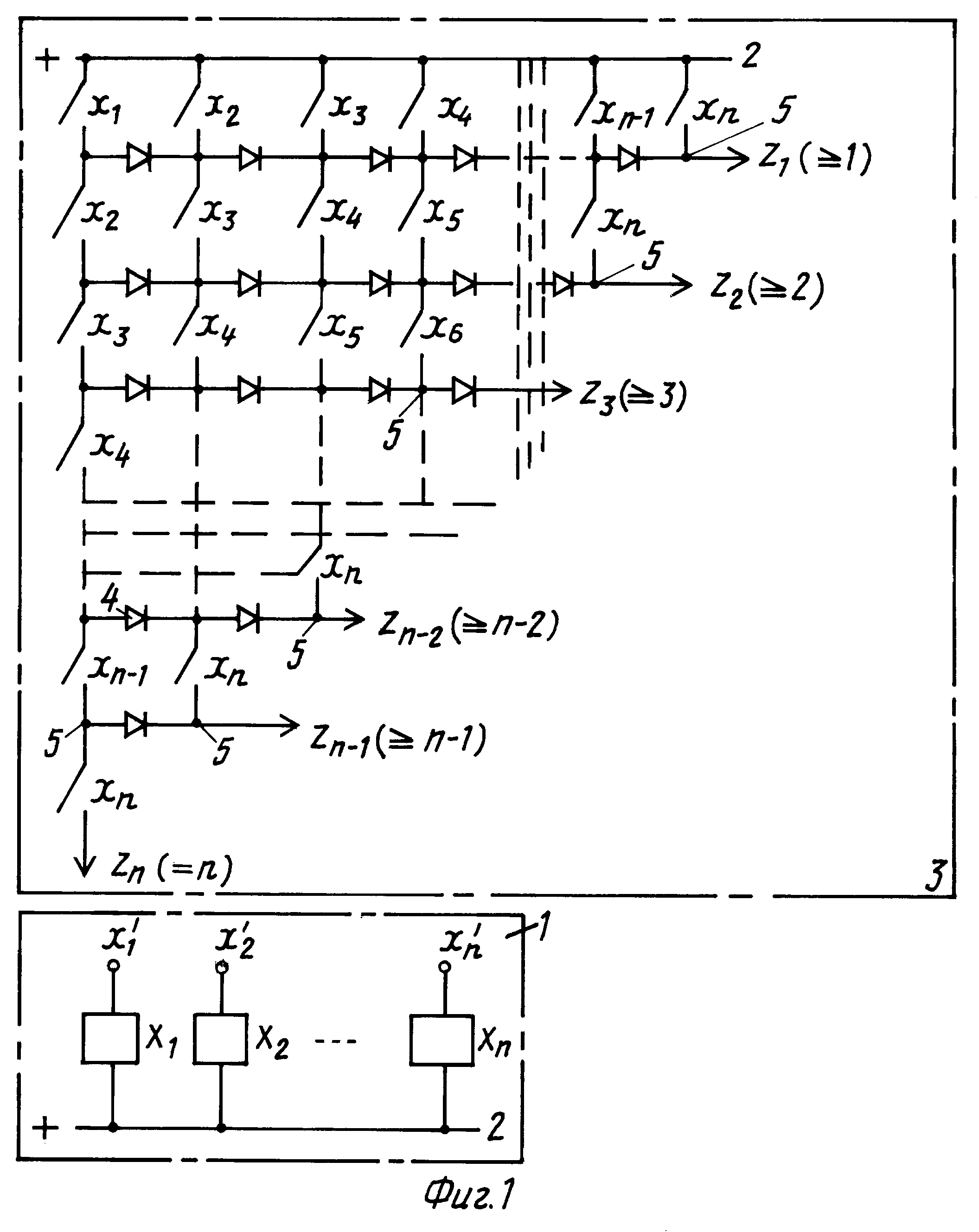 Изобретение относится к области технической кибернетики, в частности к системам управления, контроля, диагностики. Решение задачи по формированию управляющих сигналов на группу исполнительных элементов, включение в работу которых происходит только после формирования для данного исполнительного элемента заданного логического порога срабатывания, осуществляется с помощью многополюсного модуля с логическими порогами, имеющего n входов (управляющих обмоток блока реле) и треугольной контактной матрицы с n выходами. На входы модуля подаются входные воздействия (сигналы двоичной последовательности), а на выходах матрицы формируются надежные сигналы управления исполнительными элементами, соответствующие различным уровням (рангам) логических порогов, устойчивые, в отдельных случаях, к случайным и систематическим отказам элементов структуры модуля. Для достижения задачи формирования сигналов управления исполнительными элементами с заданными логическими порогами срабатывания достоверностью, равной 1, используется блок реле и контактная треугольная матрица, представляющая собой мостиковую (класса Н) структуру, описываемая для каждого выхода матрицы системой симметрических булевых функций, реализуемых схемами "голосования". Треугольная матрица построена на нормально разомкнутых контактах блока реле модуля, которые размещены по ярусам с убыванием на единицу номеров контактов в каждом столбце, одноименные диагональные контакты матрицы развязаны диодами. Два смежных контакта любого столбца матрицы, а также средняя точка двух последовательно соединенных диодов матрицы образуют узлы. На выходных узлах каждой строки матрицы формируются сигналы управления исполнительными элементами с нижним уровнем логического порога, соответствующего порядковому номеру выхода контактной матрицы. Верхний ярус матрицы составлен нормально разомкнутыми контактами всех n реле и подключен к плюсовой шине источника питания. Нижний ярус заканчивается одним замыкающим контактом реле Хn, на выходе которого формируется сигнал с логическим порогом ранга =n. Блок реле имеет Х1, Х2, Х3, ... Хn управляющих обмоток, подключенных к полосовой шине источника питания, на входы которых подаются входные воздействия x'1, x'2, x'3 ... 'n, где xi∈0,1. Наиболее целесообразное применение многополюсного модуля с логическими порогами - это в ядерной энергетике, в системах, обеспечивающих высокую степень готовности к применению технически сложных систем космической и ракетной техники, что является техническим результатом. 3 ил.