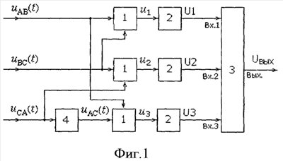 Использование: в области электротехники. Технический результат заключается в повышении чувствительности. Устройство содержит мини-селектор с тремя входами, к которым подводят три напряжения постоянного тока, посредством которых выявляют минимальное из трех отклонений модулей междуфазных напряжений в условиях нормального и аварийного функционирования трехфазной системы электроснабжения, при этом первое подводимое к мини-селектору напряжение постоянного тока, выделяют из несинусоидального напряжения, которое получают в результате перемножения первого синусоидального междуфазного напряжения на отстающее от первого второе синусоидальное междуфазное напряжение, второе подводимое напряжение получают из несинусоидального напряжения, получаемого в результате перемножения второго синусоидального междуфазного напряжения на третье синусоидальное междуфазное напряжение, опережающее первое опорное синусоидальное напряжение, третье напряжение получают из несинусоидального напряжения, получаемого в результате перемножения первого опорного синусоидального междуфазного напряжения на инверсное третье синусоидальное междуфазное напряжение. 4 ил.