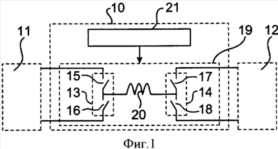 Использование: в области электротехники. Технический результат - регулирование и балансировка мощности между двумя центрами с обеспечением минимальной длины кабелей между центрами и обеспечение стабилизации постоянного напряжения. Устройство предназначено для управления передачей мощности между двумя центрами (11, 12) постоянной сети. При этом центры представляют собой узлы соединений источник-нагрузка, содержат защитные и контактные элементы, размещены в разных зонах системы распределения мощности, причем сеть является бортовой. Устройство содержит электронный преобразователь (19) мощности, содержащий два соединенных между собой через индуктивность (20) коммутационных элемента (13, 14), каждый из которых состоит из двух ключей, а также модуль (21) управления этим преобразователем, обеспечивающий возможность регулируемой передачи энергии на постоянном токе и стабилизации постоянного напряжения. 3 з.п. ф-лы, 7 ил.