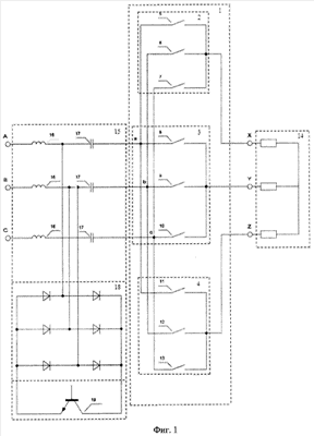 Повышающе-понижающий непосредственный преобразователь частоты относится к электротехнике, а именно к области силовой электроники, и может быть использован для непосредственного преобразования многофазного переменного напряжения одной частоты в многофазное переменное напряжение другой частоты, регулируемое как вниз, так и вверх от частоты входного напряжения, и с возможностью получения выходного напряжения как большей величины, чем входное напряжение, так и меньшей. Такие преобразователи применимы прежде всего для целей частотного регулирования электропривода переменного тока, а также в автономных системах генерирования переменного тока. Предлагаемый повышающе-понижающий непосредственный преобразователь частоты состоит из классического трехфазно-трехфазного непосредственного преобразователя частоты на девяти ключах переменного напряжения, на вход которого включена коммутируемая LC-цепь. Она состоит из последовательно соединенных с каждой фазой входа накопительного реактора и накопительного конденсатора, а также трехфазного мостового диодного выпрямителя с транзистором на выходе, при этом накопительные реакторы и накопительные конденсаторы включены последовательно между питающей сетью и входами классического непосредственного преобразователя частоты. К точкам соединения накопительных реакторов и накопительных конденсаторов подключены входы трехфазного мостового диодного выпрямителя с транзистором на выходе. Предлагаемый повышающе-понижающий непосредственный преобразователь частоты обеспечивает технический результат - имеет более простую конструкцию. 4 ил.