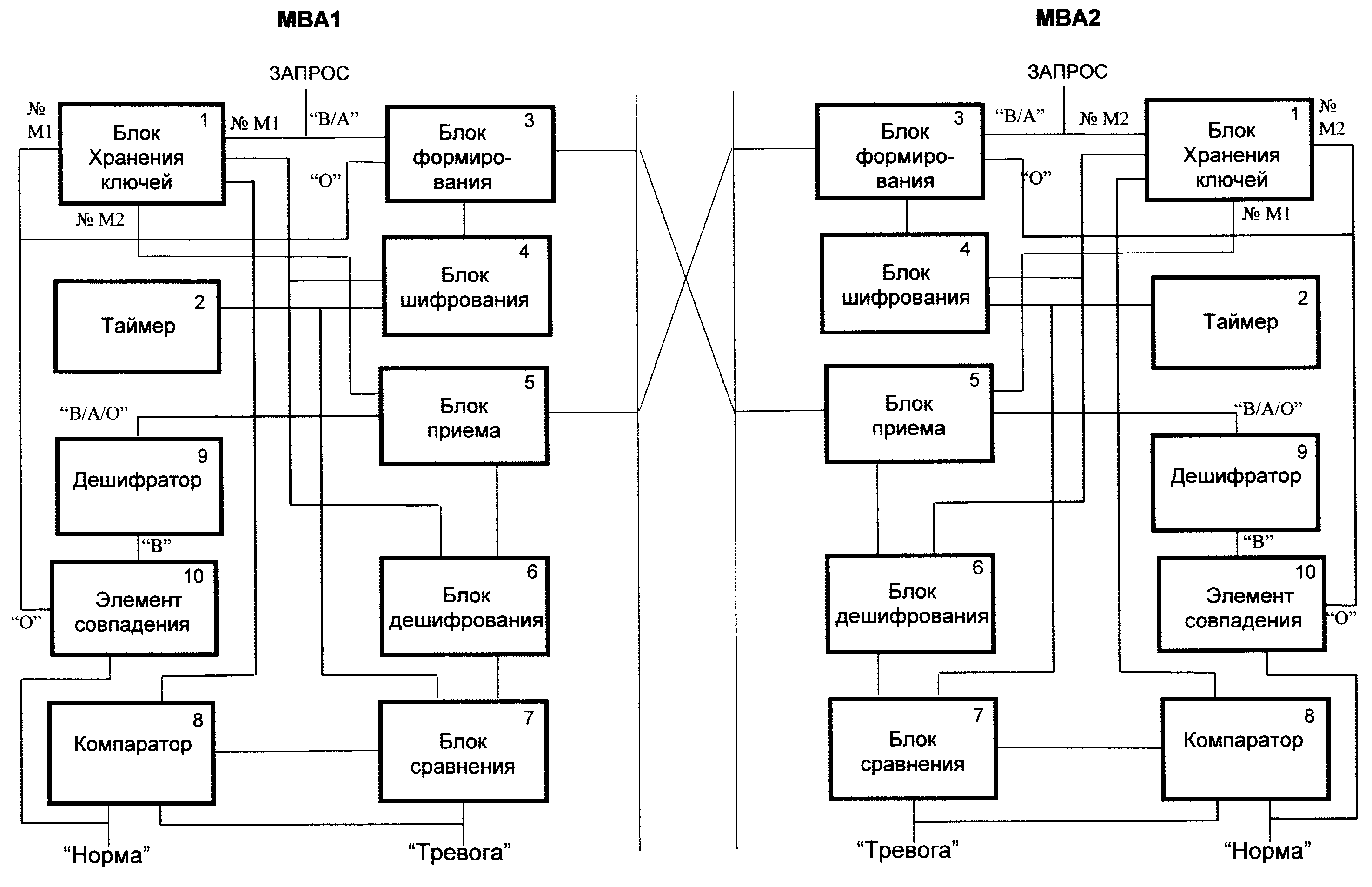 Изобретение относится к распределенным информационно-управляющим системам (РИУС), преимущественно к РИУС, функционирующим в реальном масштабе времени, и может быть использовано в системах различного назначения, оперирующих конфиденциальной информацией. Технический результат, достигаемый при реализации заявленного изобретения, состоит в расширении области применения технического решения. Механизм аутентификации в РИУС содержит два или более унифицированных функционально законченных модуля взаимоаутентификации (МАВ), которыми оснащены абонентские пункты и центры обработки данных (серверы приложений) системы, причем каждый из n MBA содержит блок хранения ключей, блоки шифрования и дешифрования, таймер, блок формирования и блок приема, блок сравнения, компаратор, дешифратор и элемент совпадения. 1 ил.
